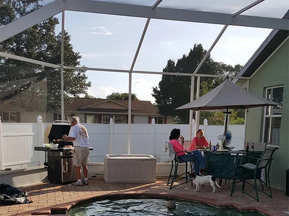 The ceiling of this charming beach house porch was vaulted. Screen enclosures come in several types and materials. The pool is heated at all times to a comfortable 88 degrees by both a heat pump and solar panels. Everyone enjoys socializing in the leaders' spacious (36' x 60') screened enclosure, perfectly safe from mosquitoes. It offers family and friends a comfortable place to gather while being cooled and illuminated by ceiling fans.